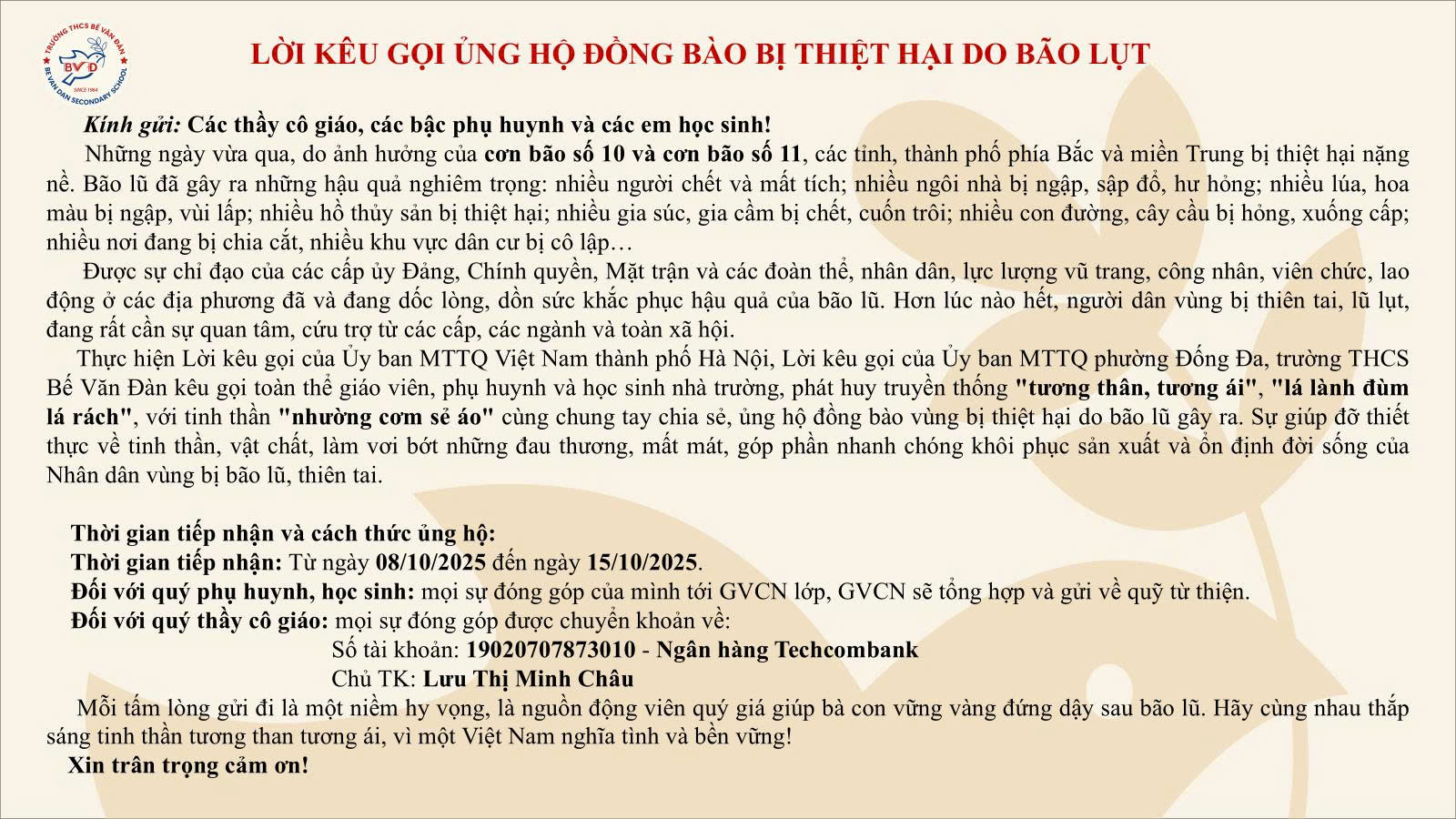 Thực hiện công văn chỉ đạo của Sở Giáo dục và Đào tạo Hà Nội về việc phát động phong trào ủng hộ, giúp đỡ đồng bào các tỉnh miền Bắc đang chịu thiệt hại nặng nề do mưa lũ kéo dài, tập thể cán bộ, giáo viên, nhân viên, phụ huynh học sinh và học sinh Trường THCS Bế Văn Đàn đã chung tay quyên góp với tinh thần “Vì đồng bào ruột thịt – Lá lành đùm lá rách – Nghĩa tình sẻ chia”. Những phần quà tuy nhỏ bé nhưng chứa đựng tấm lòng yêu thương, sự sẻ chia của thầy và trò nhà trường gửi tới các em học sinh và bà con vùng lũ. Thông qua hành động thiết thực, đầy nghĩa tình này, nhà trường mong muốn khơi dậy trong các em học sinh lòng nhân ái, phát huy tinh thần đoàn kết, “lá lành đùm lá rách” của dân tộc.