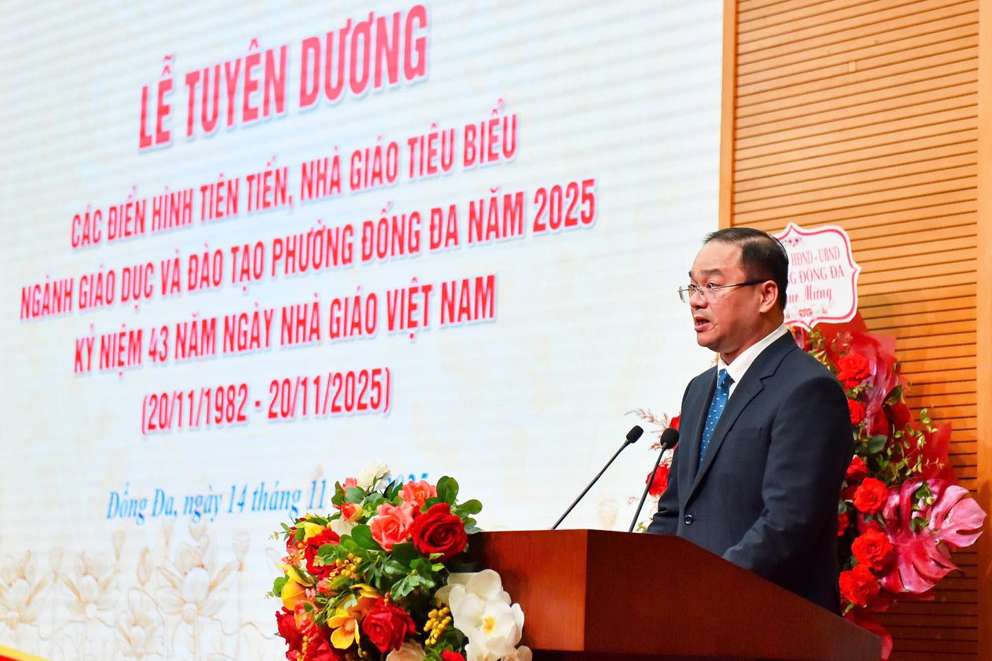 Trong diễn văn tại buổi lễ, Phó Chủ tịch UBND phường Đống Đa Nguyễn Trọng Hải nhấn mạnh, Ngày Nhà giáo Việt Nam hằng năm luôn là thời điểm để toàn xã hội bày tỏ lòng biết ơn sâu sắc đối với những người làm công tác giáo dục – những “người lái đò thầm lặng” miệt mài gieo mầm tri thức, vun đắp tâm hồn và nhân cách cho nhiều thế hệ học trò. Đây cũng là dịp tôn vinh những cống hiến cao quý của đội ngũ nhà giáo – những người đã chọn nghề dạy học bằng tình yêu thương, trách nhiệm và niềm tin vào tương lai con người.